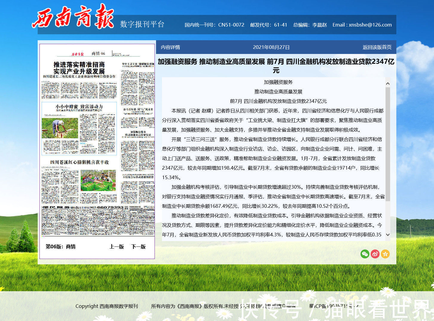 (来源:西南商报 2021年8月27日 第06版:商情 加强融资服务 推动制造业高质量发展 前7月 四川金融机构发放制造业贷款2347亿元)